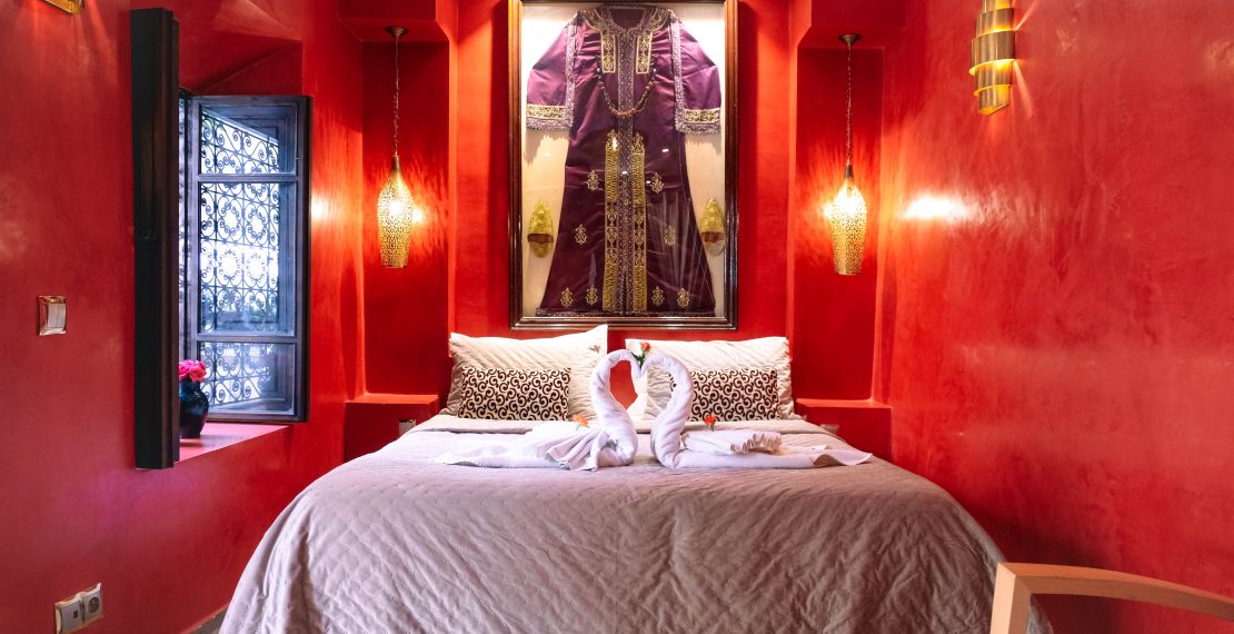 La chambre africaine se distingue par une déclinaison de couleurs chaudes qui rappelle l’Afrique